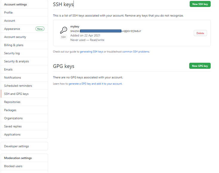 - github 로그인 후 settings -> SSH and GPG keys 창으로 이동한다.